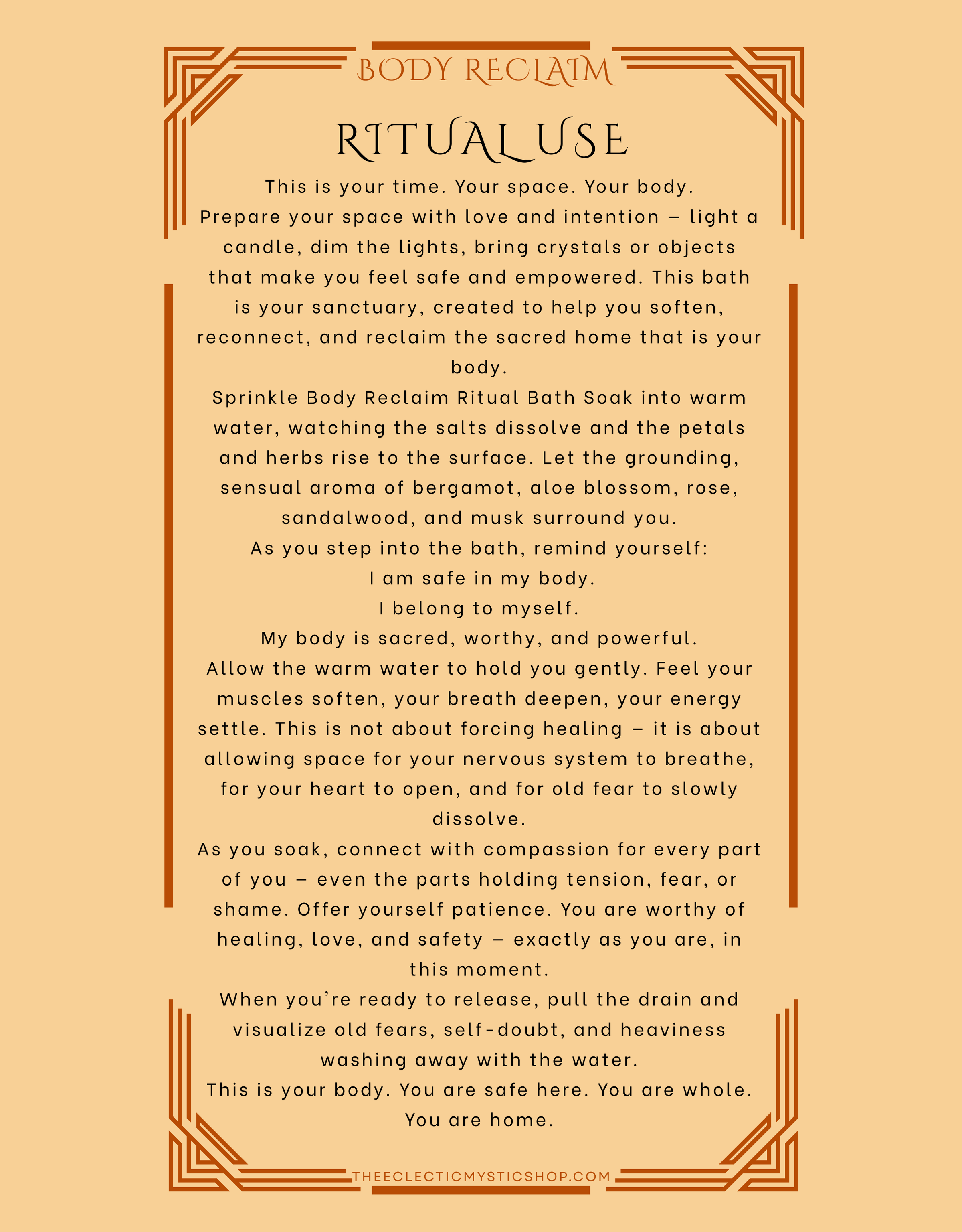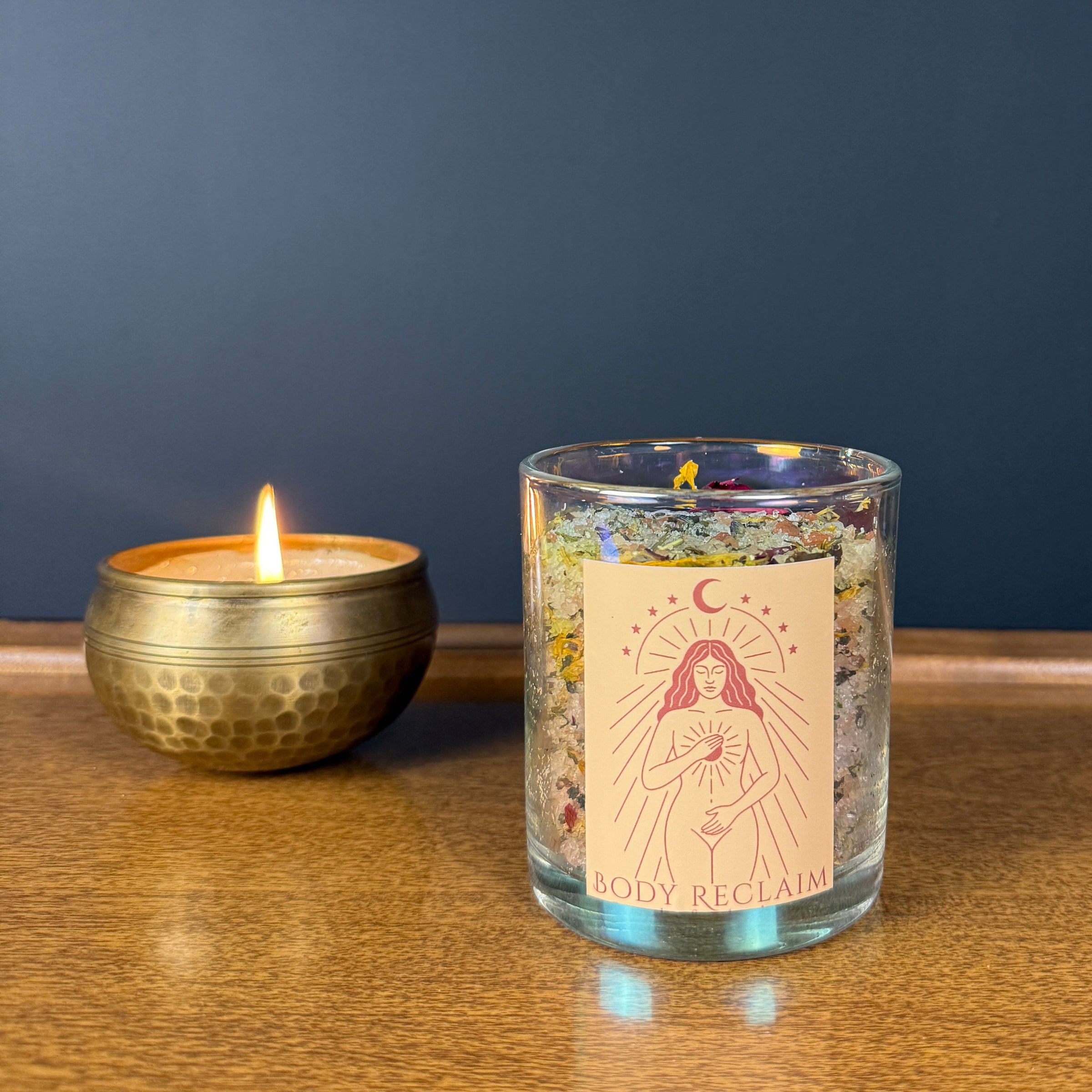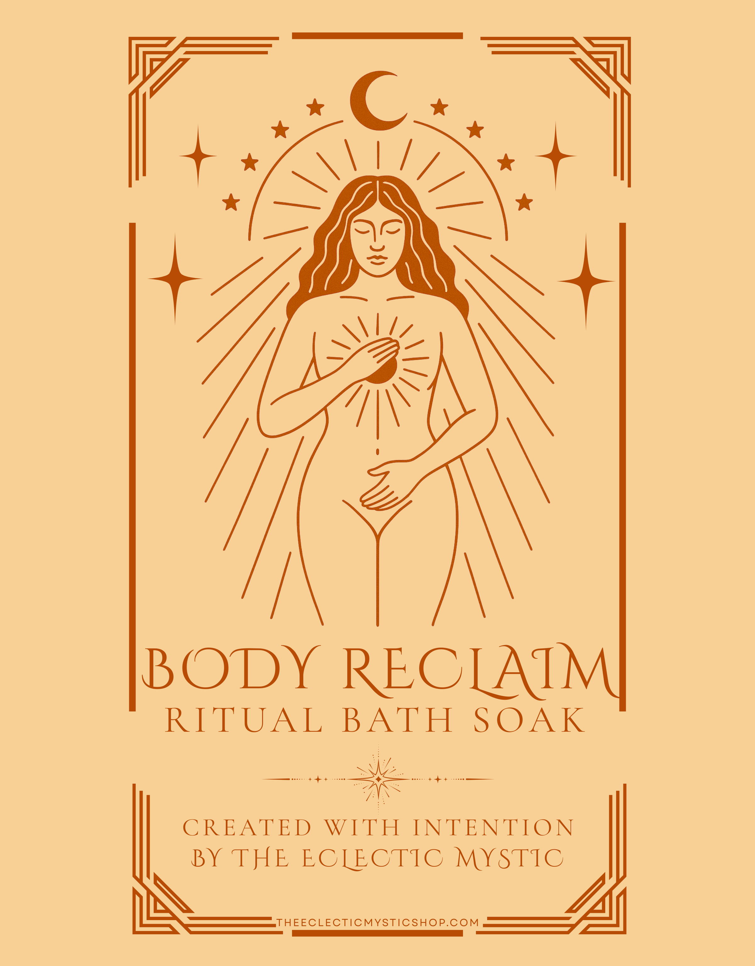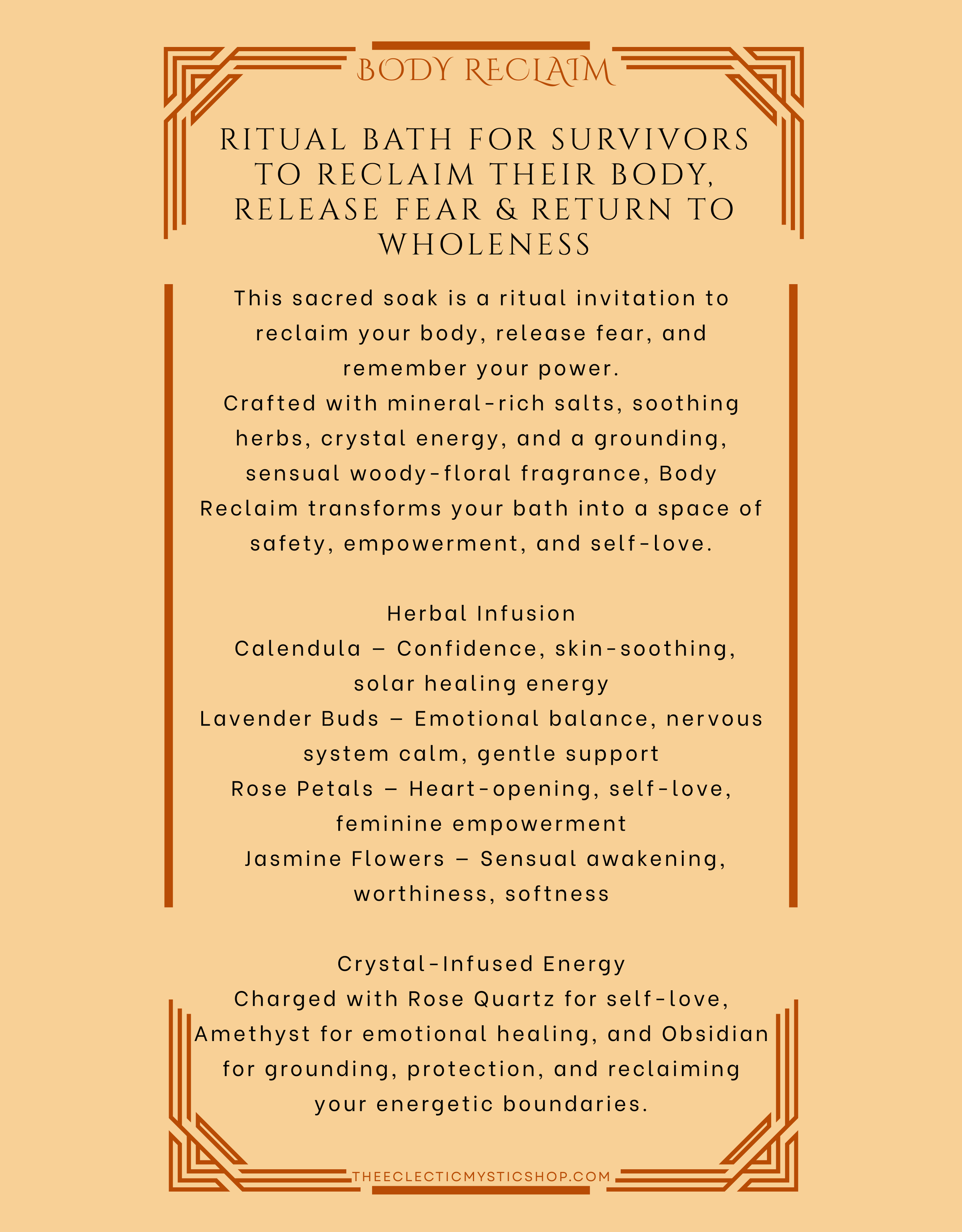 A sacred soak for survivors, Body Reclaim is a ritual invitation to reclaim your body, release fear, and return to wholeness. Crafted with mineral-rich salts, soothing herbs, crystal energy, and a grounding woody fragrance, this blend transforms your bath into a sanctuary of safety, empowerment, and self-love.