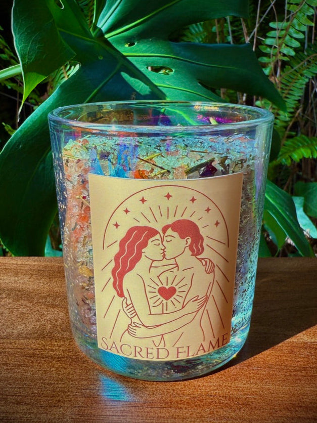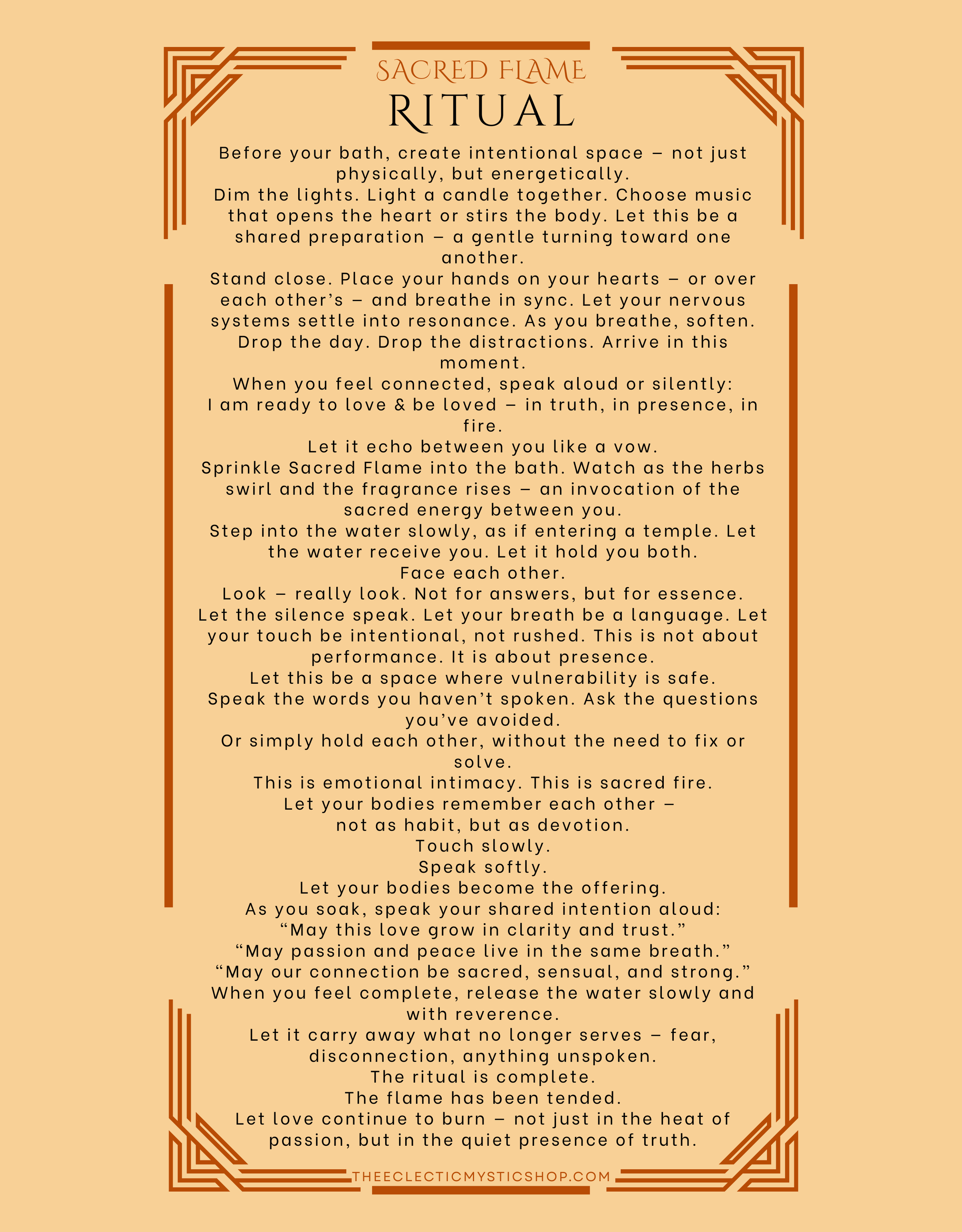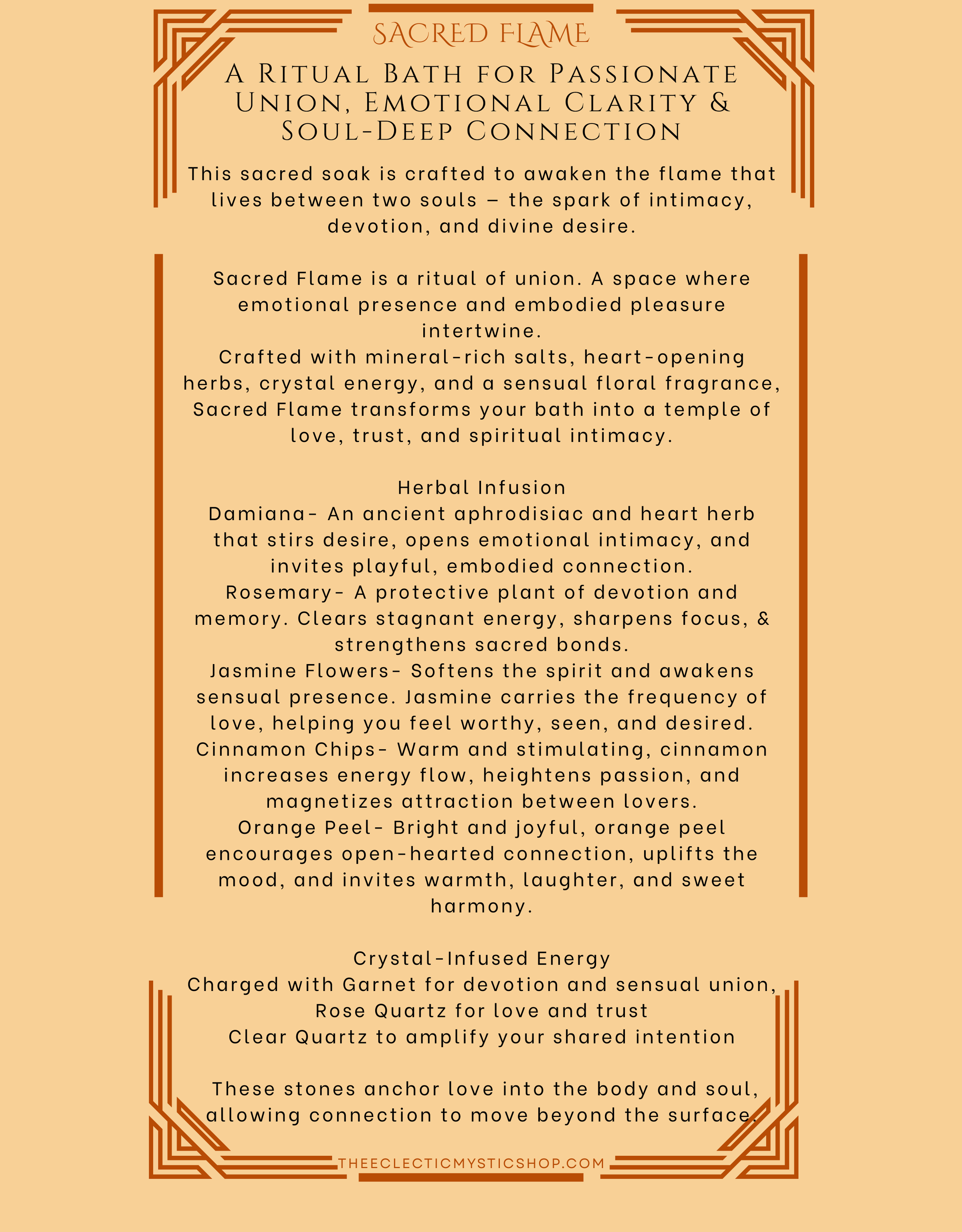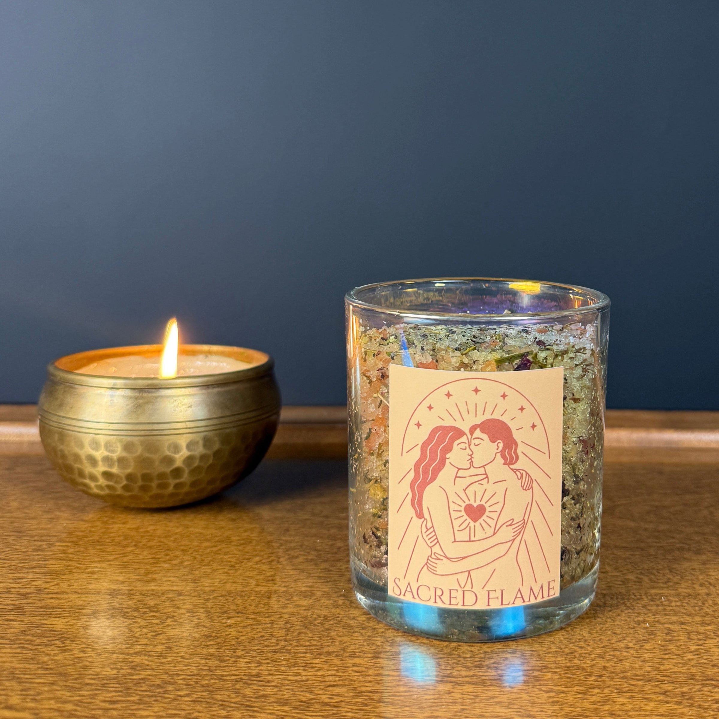 Sacred flame is crafted to awaken passion, deepen intimacy, and strengthen the sacred bond between partners. With mineral-rich salts, sensual botanicals, and crystal energy, this blend invites shared vulnerability, ignites desire, and nurtures connection, turning your bath into a ritual of love and devotion.