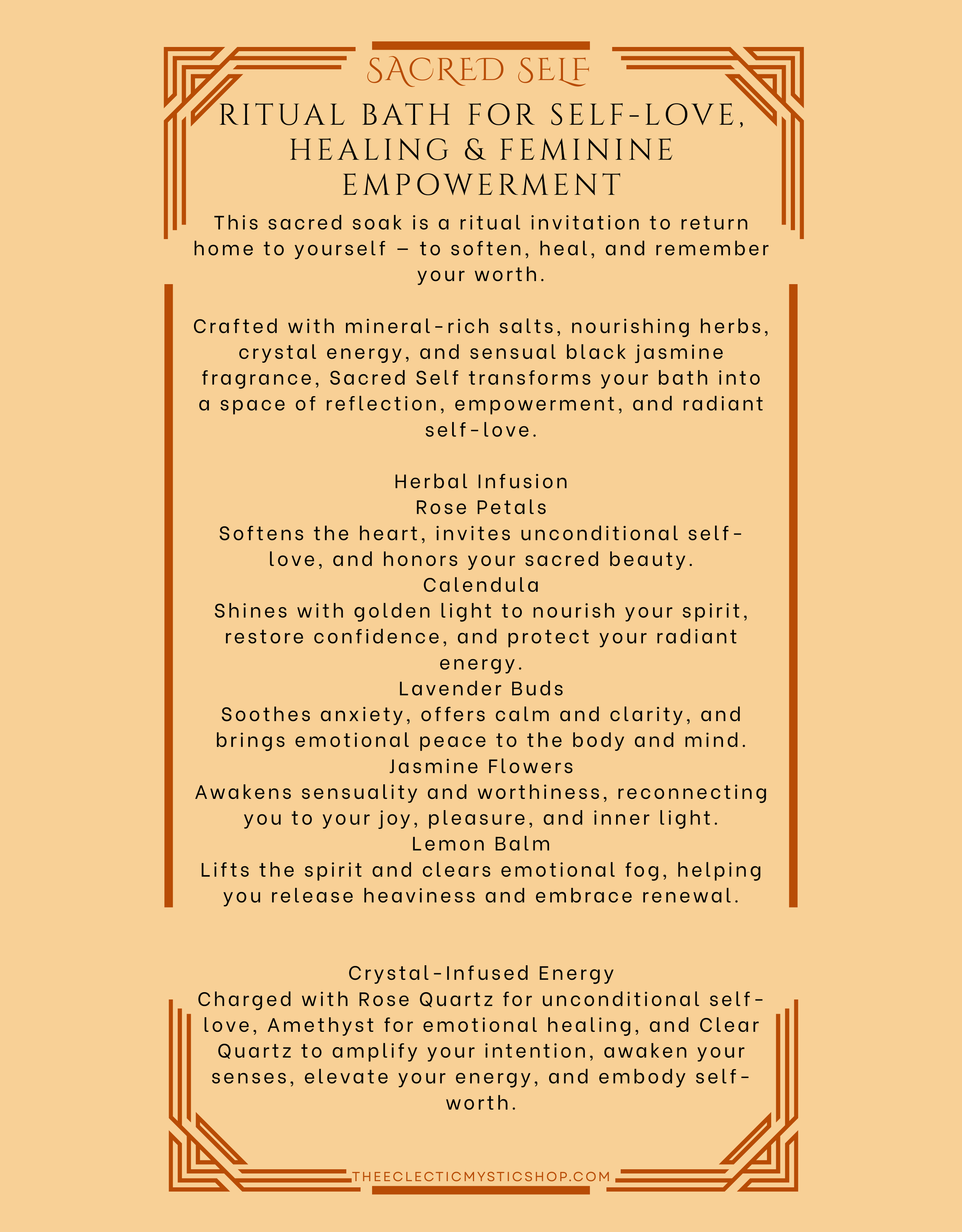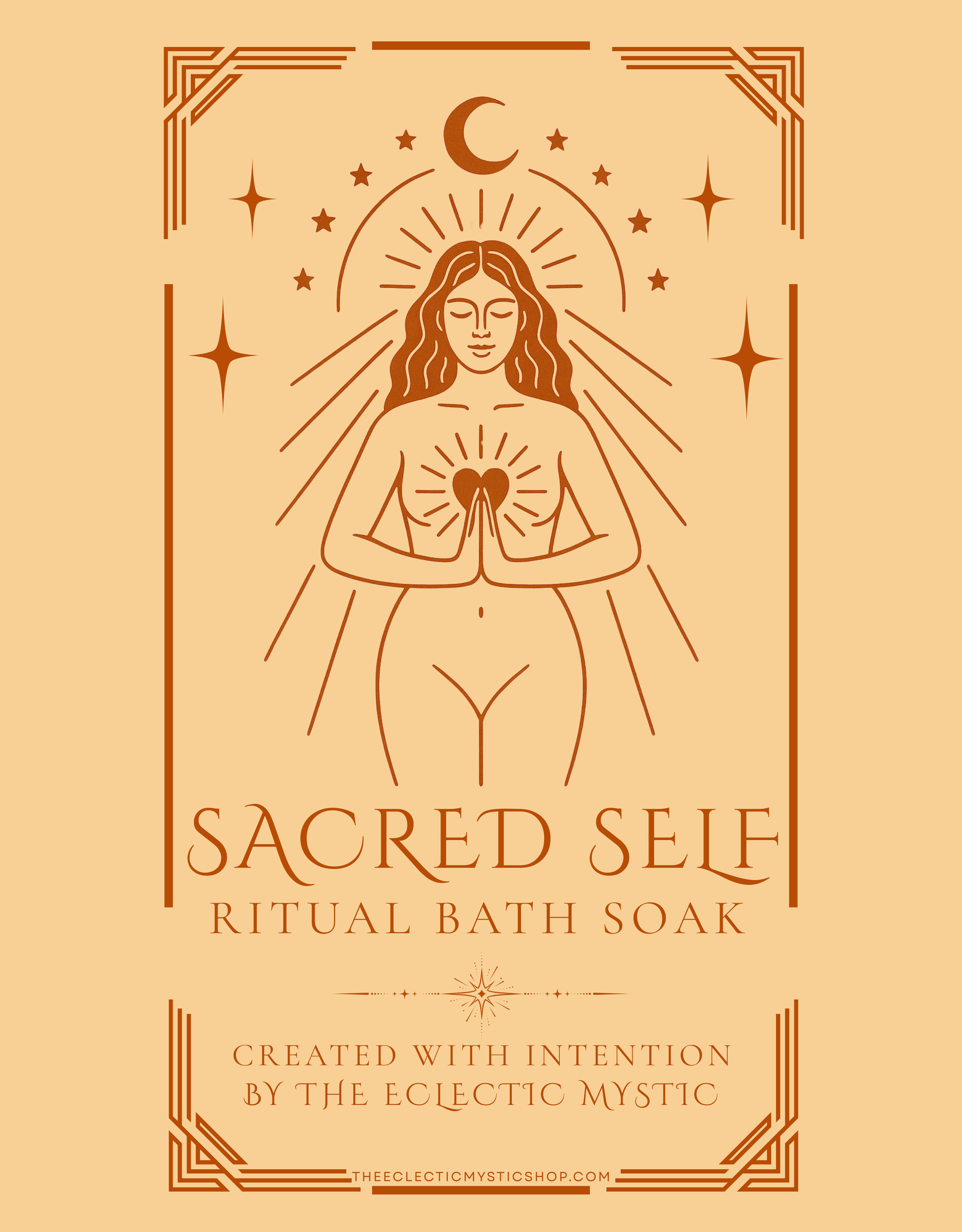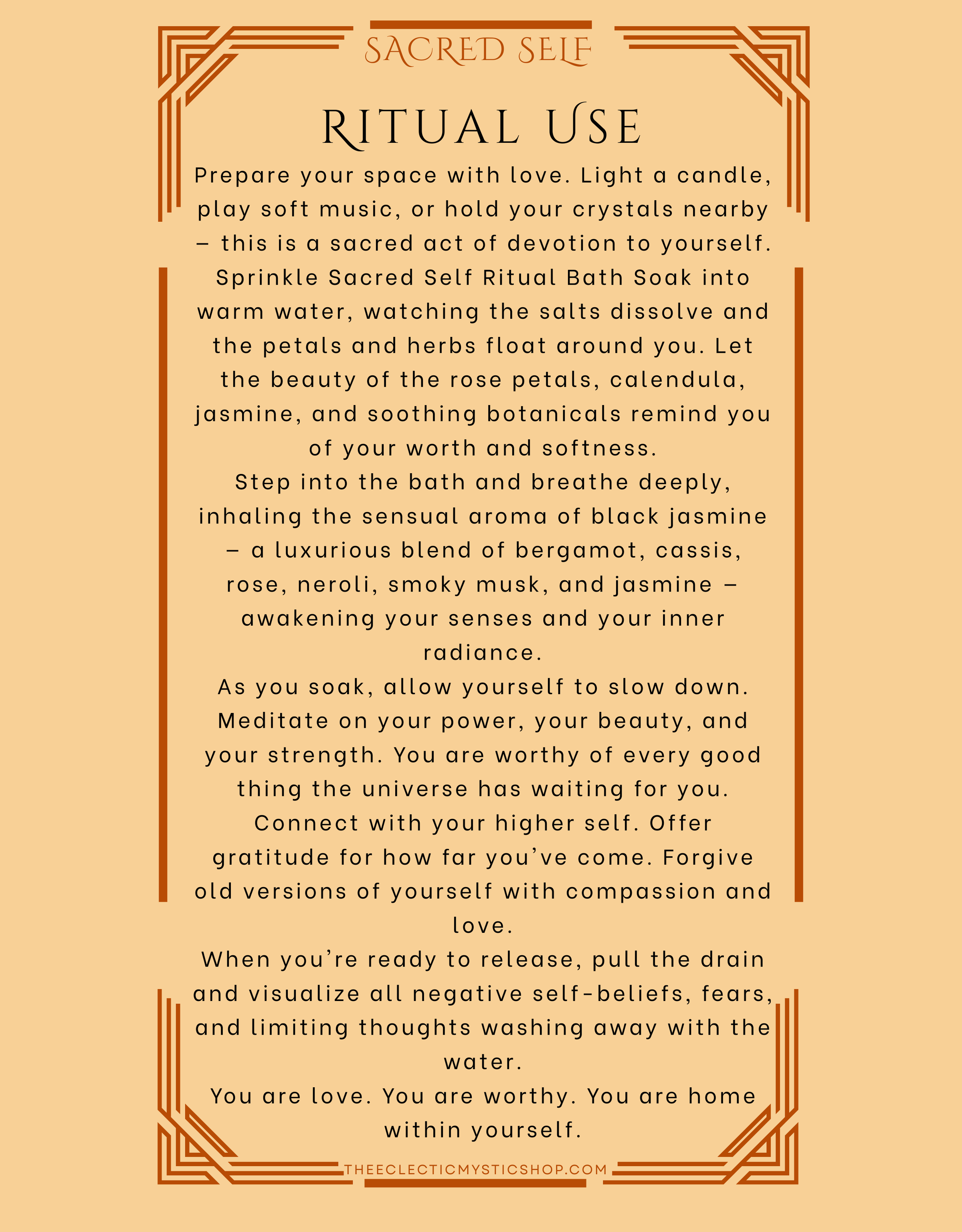 Crafted with mineral rich salts, nourishing herbs, crystal energy, and a sensual black jasmine fragrance, Sacred Self transforms your bath into a sanctuary of reflection, empowerment, and radiant self-love.