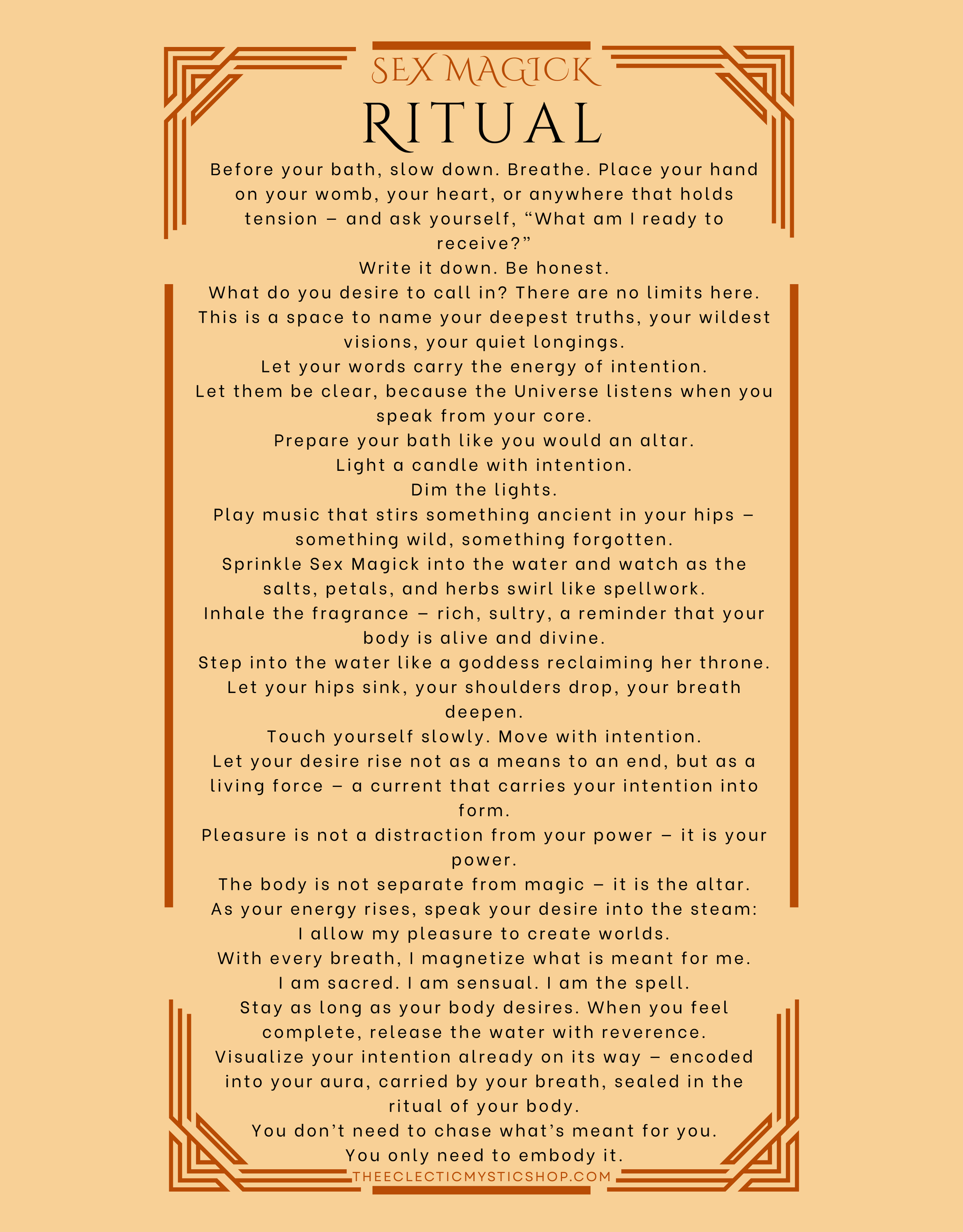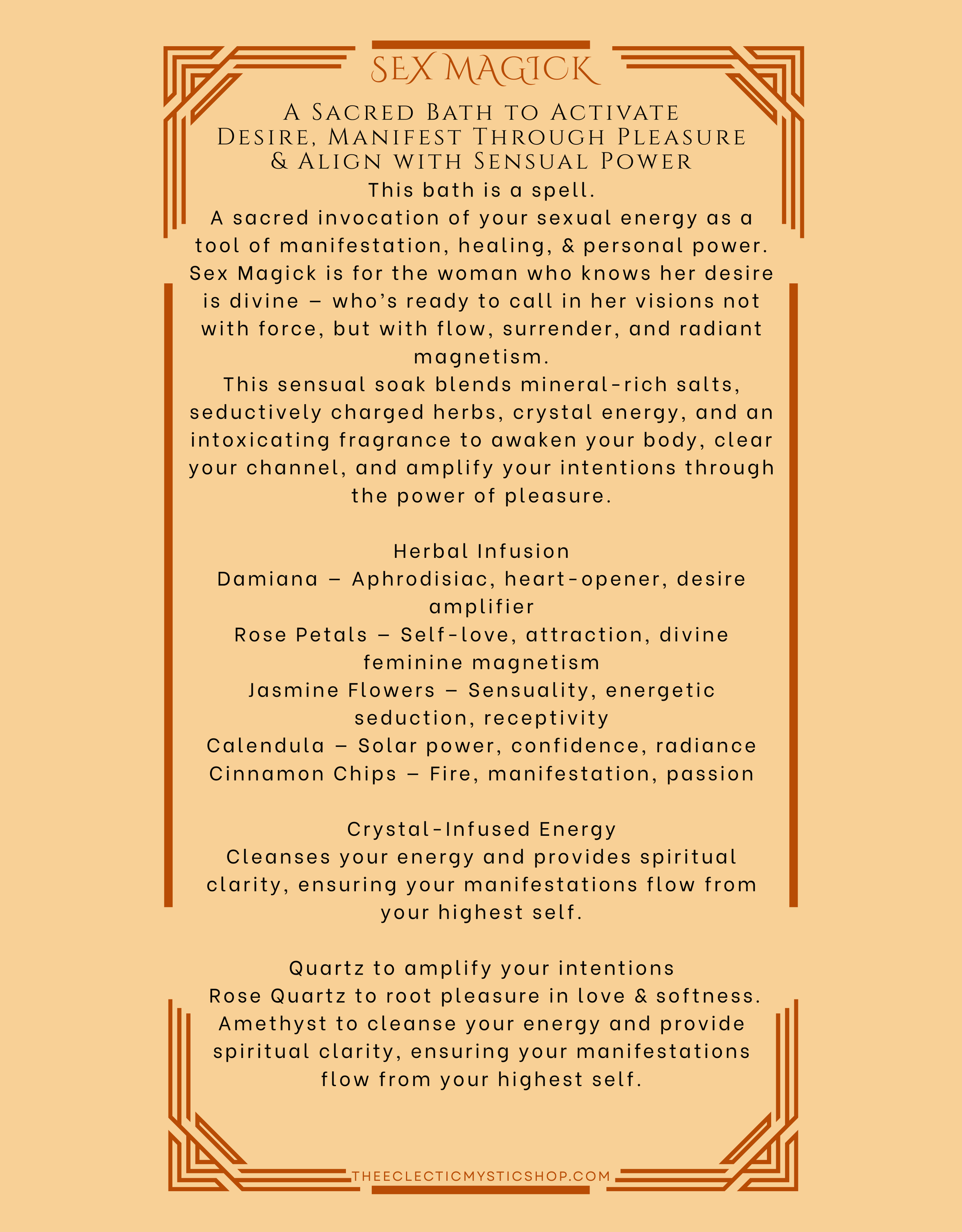 Sex Magick Ritual Bath Soak is a sacred tool for working with the most powerful energy you hold, your sexual energy. In ancient traditions, sex magick is the practice of using desire and pleasure as a force of creation and manifestation. This energy, when directed with intention, becomes a catalyst for healing, empowerment, and the embodiment of your deepest desires.
