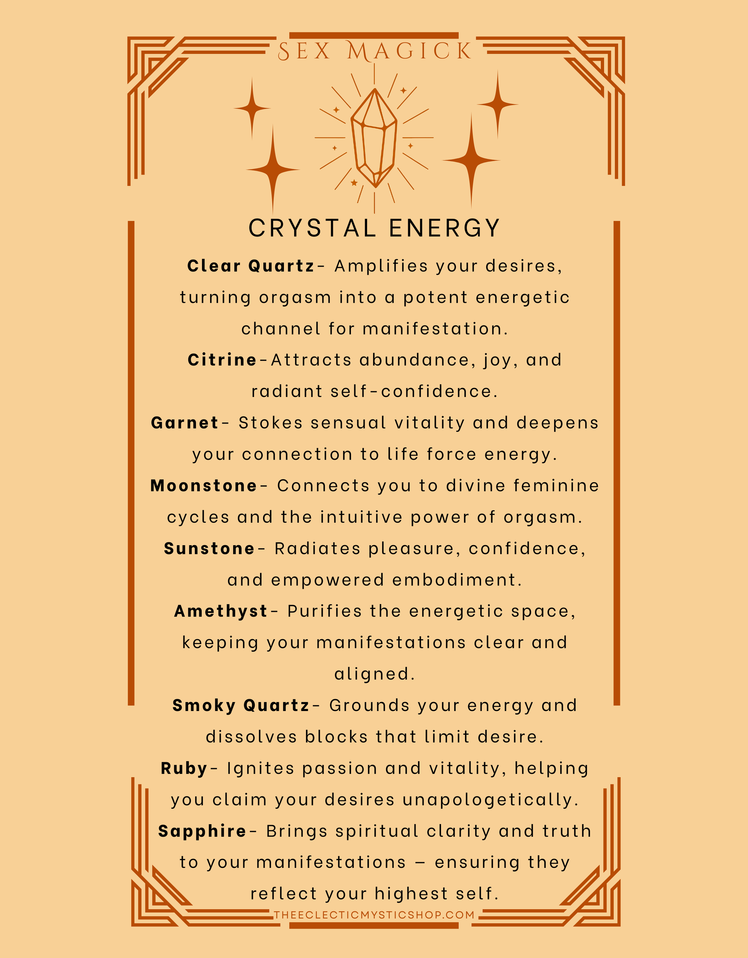 This crystal infused body oil is designed for anointing the skin during ritual, meditation, or self connection. It is not intended for intimate use, but I do offer a crystal infused lubricant crafted especially for sacred intimacy. Each blend is handcrafted with herbs and botanicals chosen to awaken magnetism, heighten sensual energy, and help you embody the sacred current of desire. While nourishing the skin, it also supports the energetic work of aligning body and spirit.