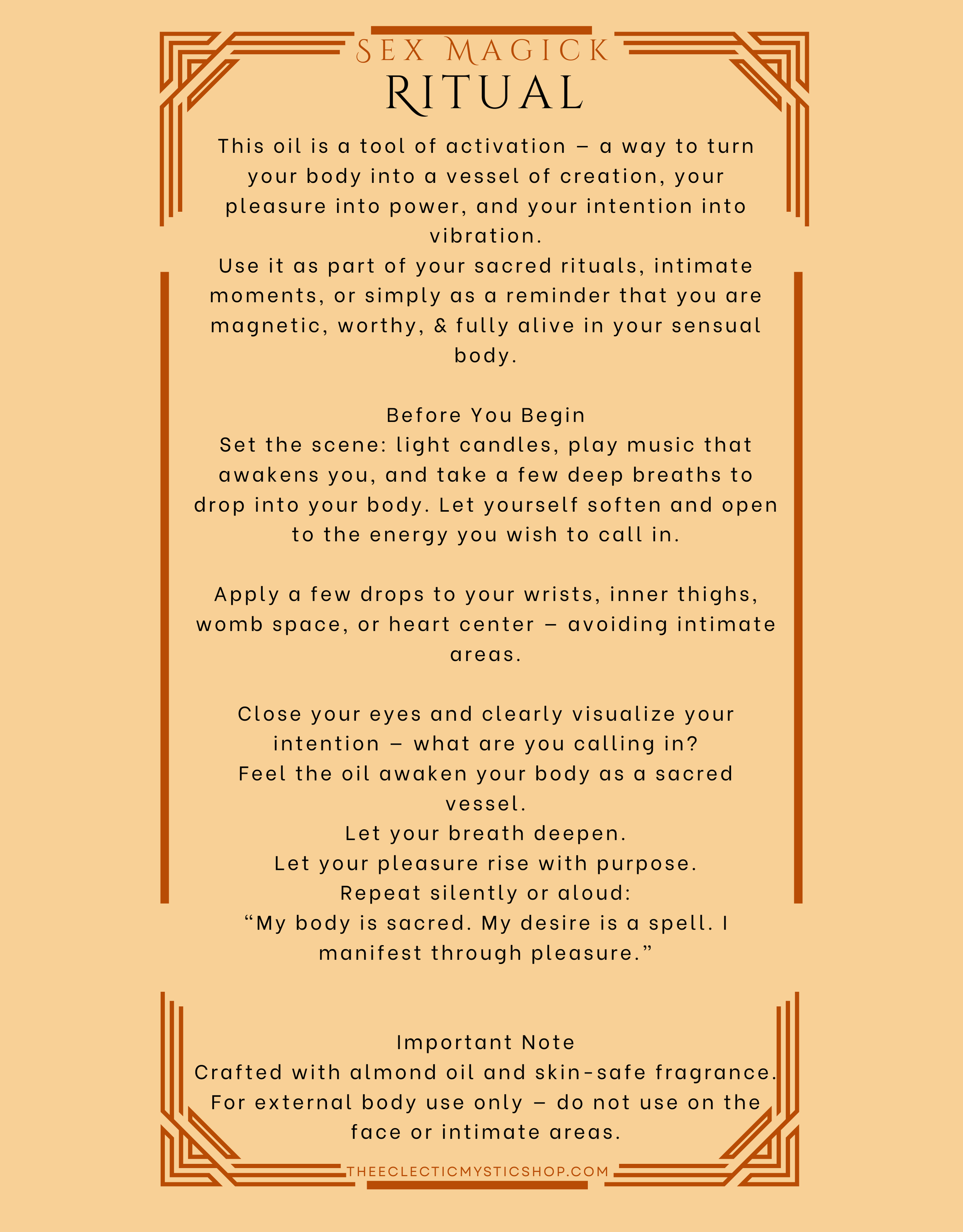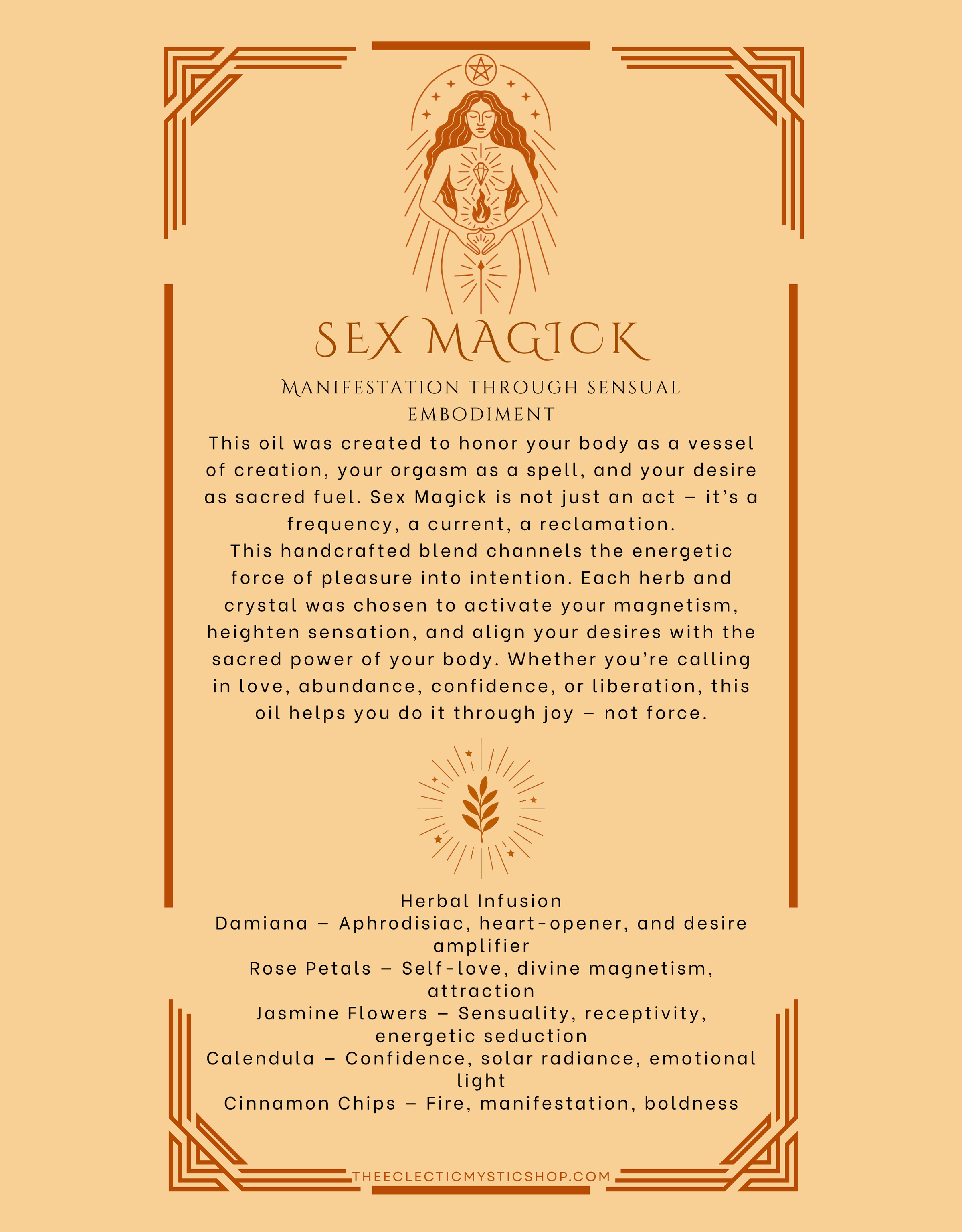 Each drop is an invocation, a reminder that your body is holy ground and your pleasure is power. Sex Magick Ritual Oil helps you manifest not through force but through joy, surrender, and radiant embodiment.