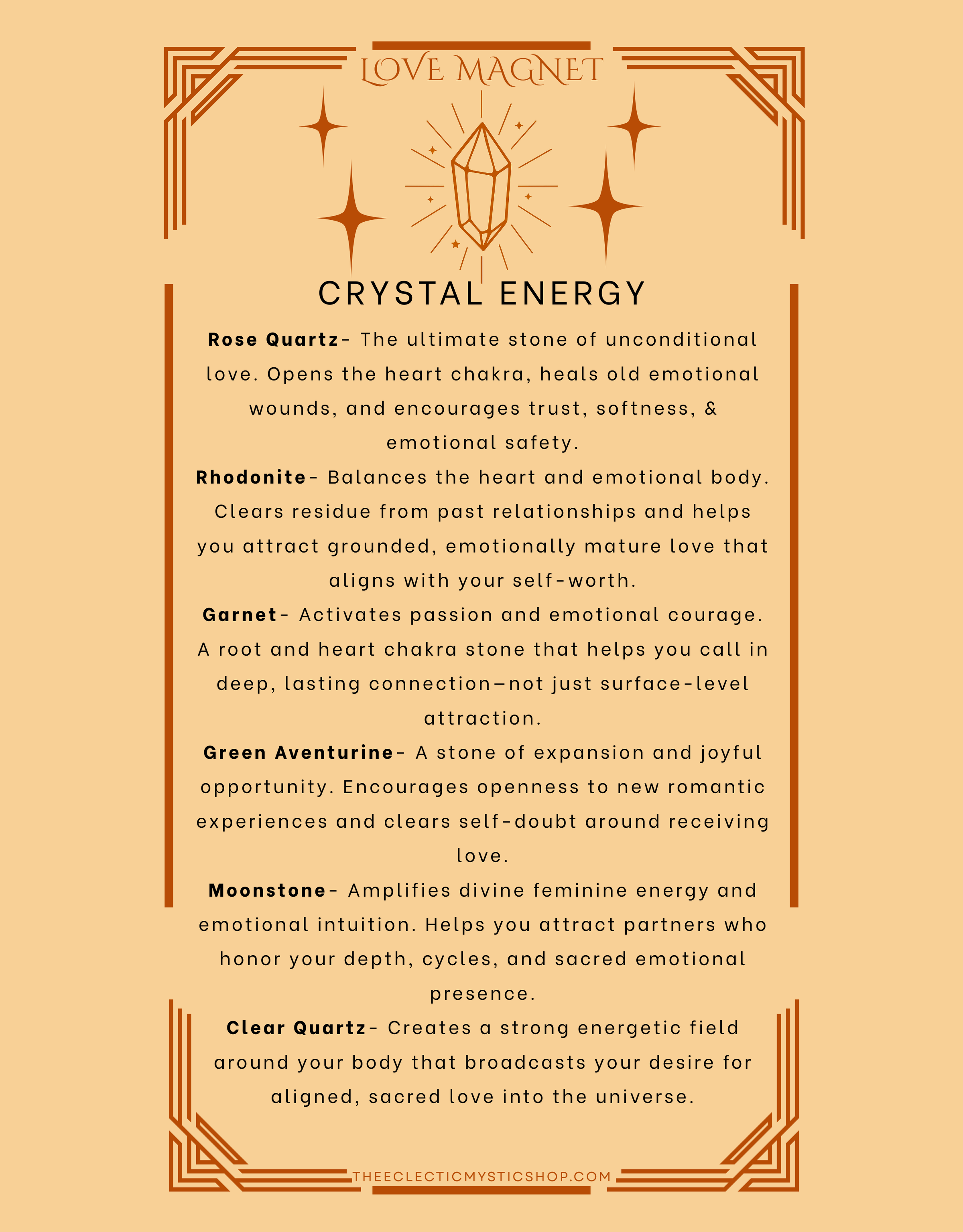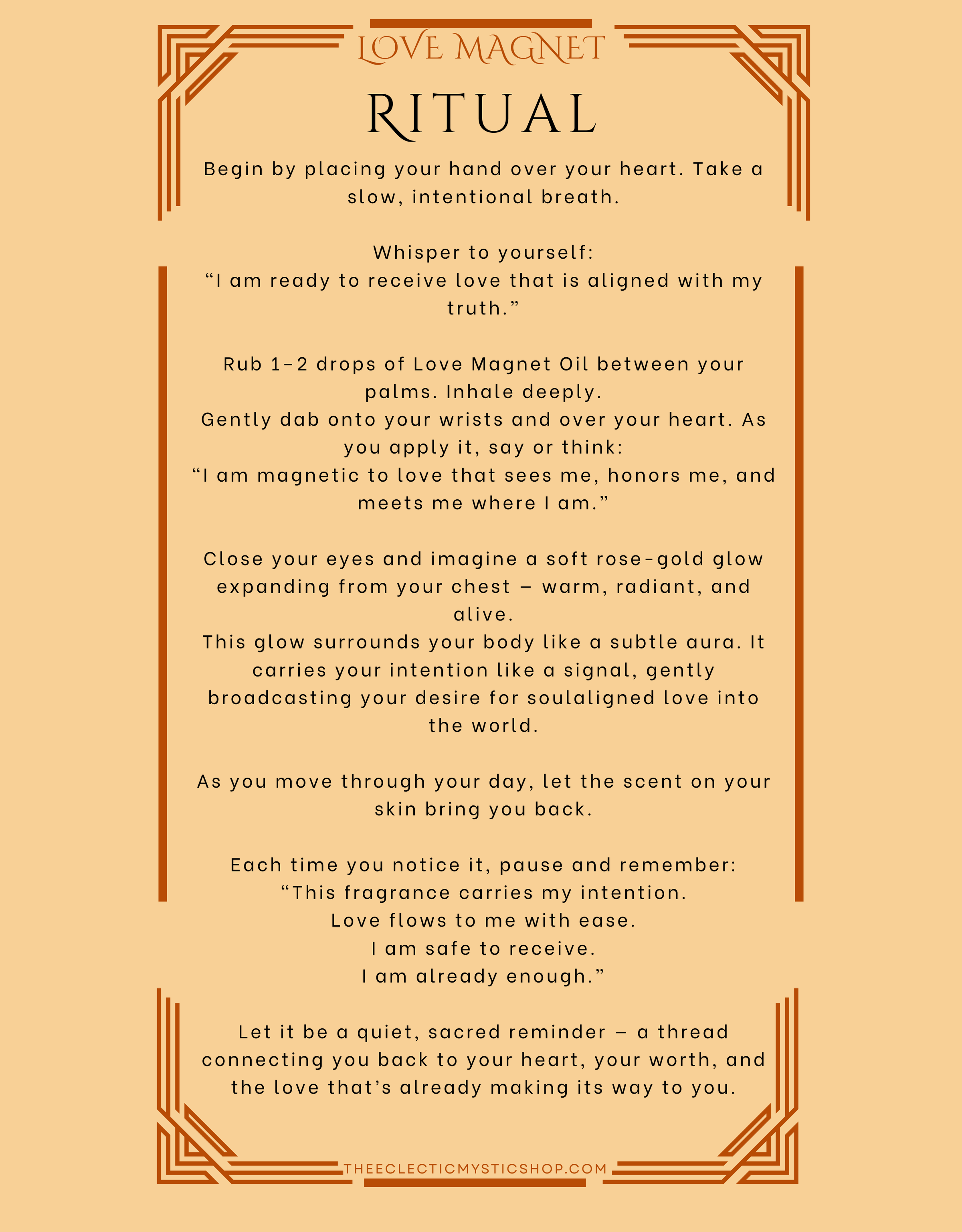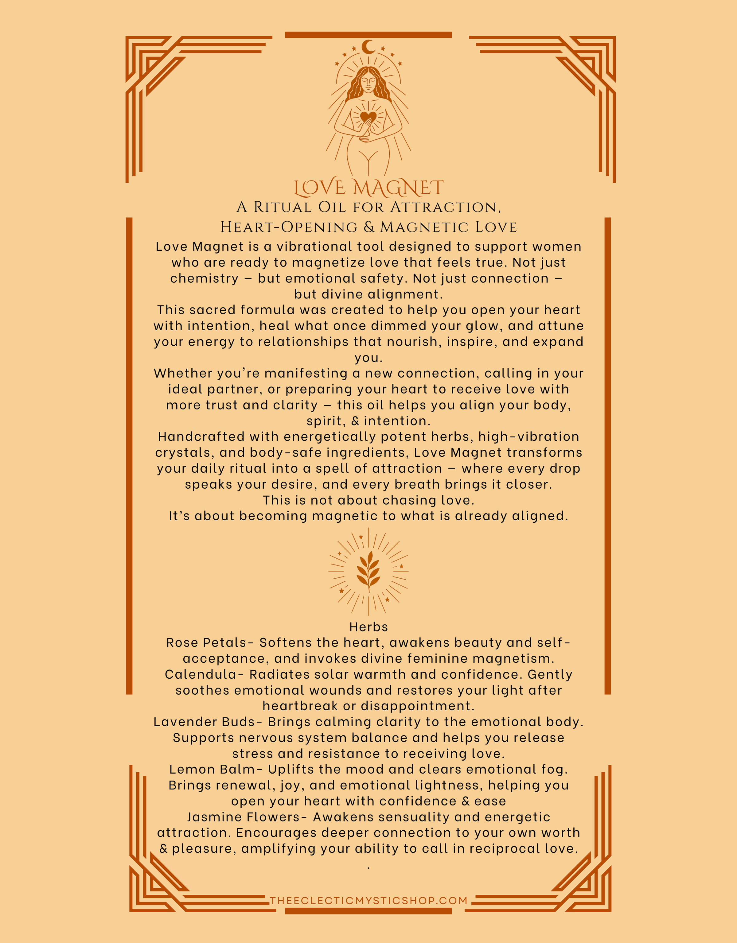 Use Love Magnet in ritual, meditation, or daily intention setting as an act of calling in connection that uplifts and empowers. It is both a sacred tool for attraction and a reminder that true love begins with self worth.